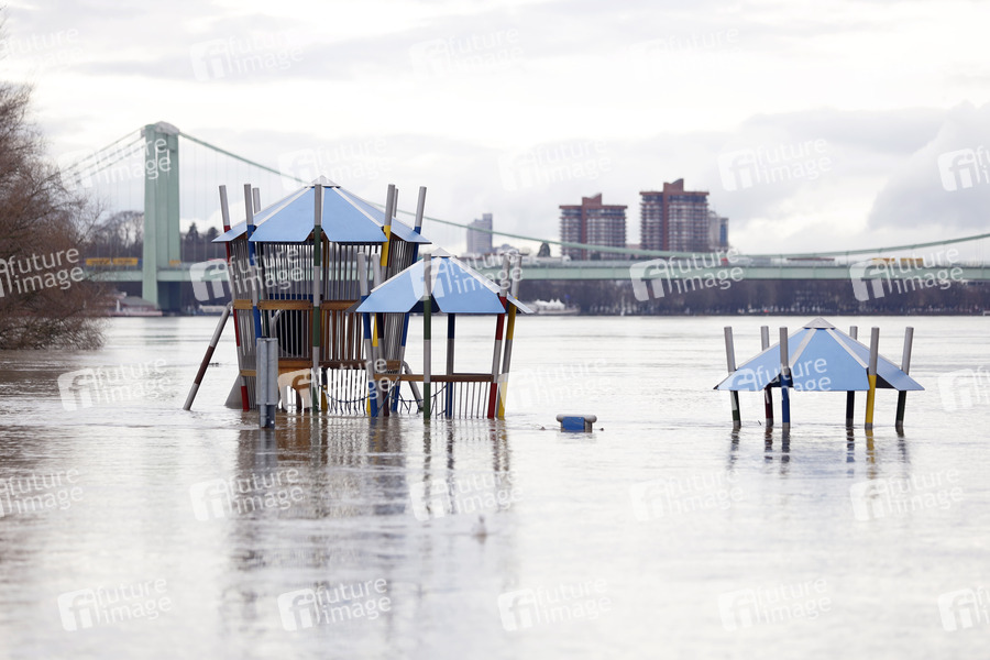 In NRW am Rhein steigt das Wasser: für die Schifffahrt gibt es erste Einschränkungen. Am Pegel Köln wird für den heutigen Mittwoch mit einem Höchststand gerechnet. Im Bild eine Impression des Hochwassers im Stadtteil Rodenkirchen. Köln, 03.02.2021