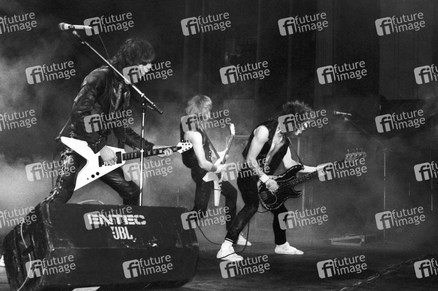 Herman Frank, Wolf Hoffman und Peter Baltes von Accept live im Hammersmith Odeon. London, 29.01.1984