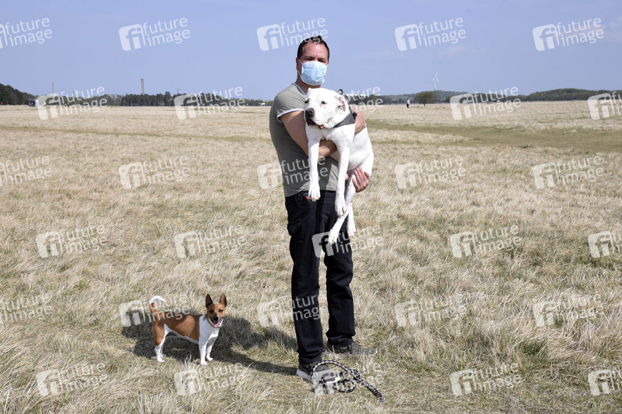 Dave Kaufmann mit seinem Hund Dean Martin und seiner Hündin Lieselotte bei einem exklusiven Fototerin während eines Spaziergangs. München, 17.04.2020