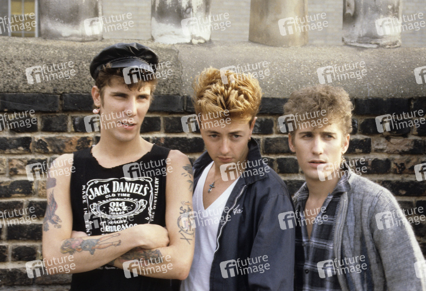 Slim Jim Phantom, Brian Setzer und Lee Rocker von den Stray Cats bei einem Photocall auf dem Dach von Arista Records. London, 22.09.1983
