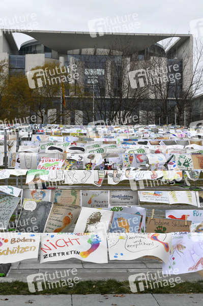 Landwirte, Klima- und Tierschützer demonstrieren unter dem Motto 'Wir haben es satt' für eine Wende in der Agrarpolitik. Vor dem Kanzleramt wird symbolisch mit rund zehntausend Fußabdrücken auf Papier eine bäuerliche, ökologische und klimafreundliche Landwirtschaft gefordert. Berlin, 16.01.2021