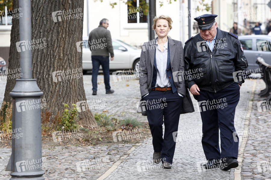 Maria Simon und Horst Krause beim Fototermin am Set des ARD-Krimis 'Polizeiruf 110 - Käfer und Prinzessin' (AT) am Rathaus Beelitz. Beelitz, 01.11.2013