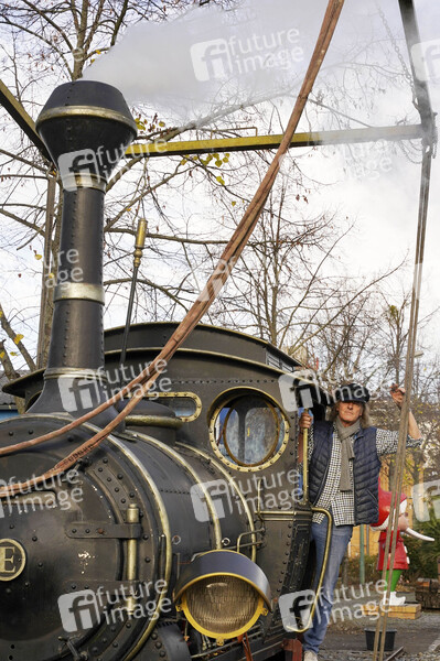 Ein weiteres Filmrequisit für die 'Giant Props' Sammlung ungewöhnlicher Originale, die Lokomotive Emma aus den Jim Knopf Filmen, wird auf der Straße der Giganten im Filmpark Babelsberg aufgestellt. Filmparkchef und 'Lokomotivführer' Friedhelm Schatz organisiert den Transport. Potsdam, 16.11.2020