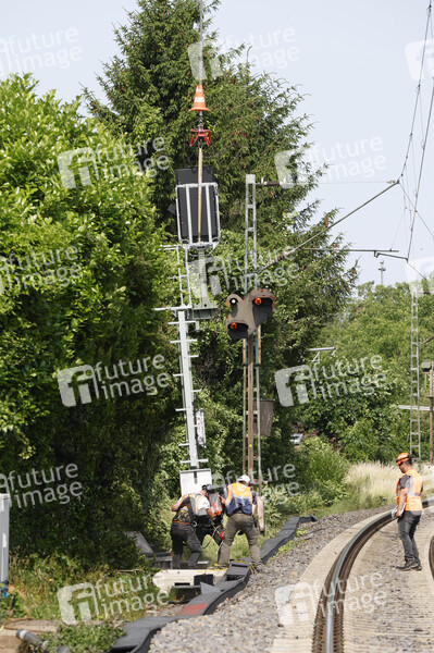 Bahnmitarbeiter bei der Signalinstallation beim Fototermin 'Helikopter fliegt Signalmaste für das neue Elektronische Stellwerk in Bonn-Beuel ein'. Es beginnt letzte große Bauphase vor der Generalsanierung der rechten Rheinstrecke im Jahr 2026. Mit Hilfe eines Helikopters werden knapp 50 Signalmaste für das neue ESTW Bonn-Beuel eingeflogen. Bonn, 14.06.2025