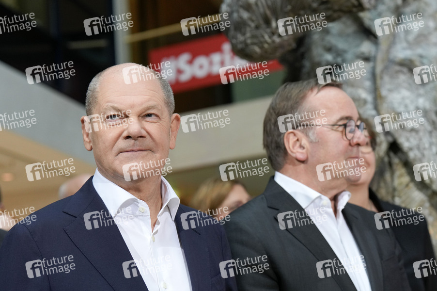 Olaf Scholz und Boris Pistorius bei der Pressekonferenz der SPD nach den Gremiensitzungen zur Beratung aktueller Themen und der Nominierung des SPD-Kanzlerkandidaten für die Bundestagswahl im Atrium vom Willy-Brandt-Haus. Berlin, 25.11.2024