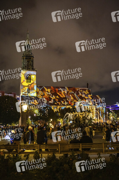 Die Marienkirche. Das Festival of Lights Berlin gehört zu den bekanntesten Lichtfestivals weltweit. Es ist ein kostenloser Event in Berlin, der jährlich im Herbst stattfindet und 10 Tage lang bekannte Berliner Sehenswürdigkeiten durch Illuminationen, lichtkünstlerische Projektionen und 3D-Mappings aufwändig in Szene setzt. Berlin, 06.10.2024