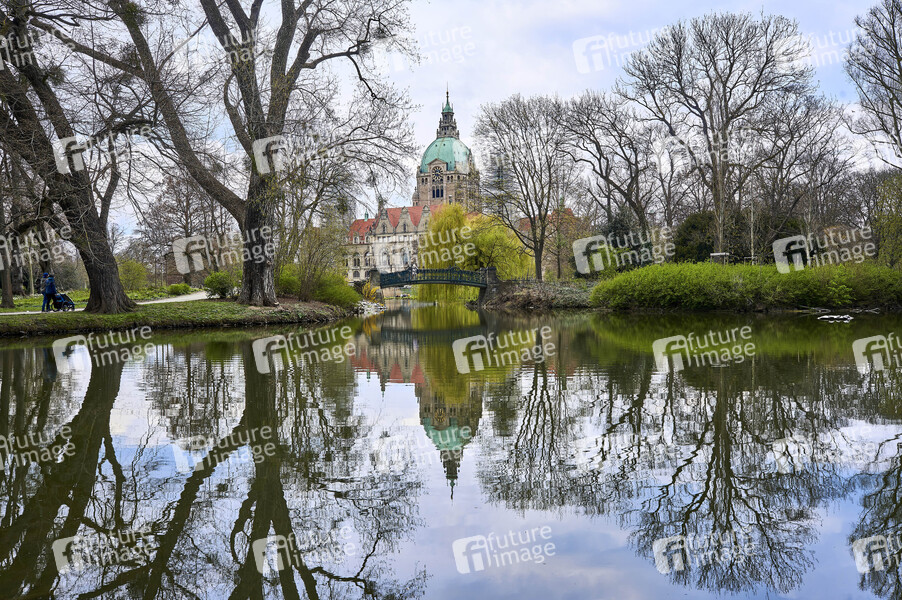 Das Neue Rathaus mit Maschteich am Maschpark. Hannover, 18.04.2021