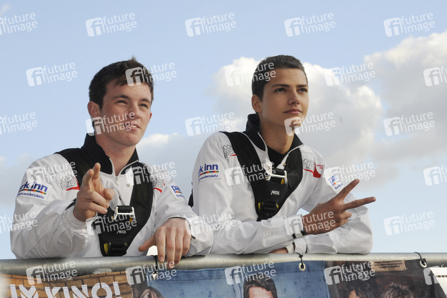 Base Flying von Jochen Schweizer mit den Hauptdarstellern von 'Gangs' auf dem Park Inn Hotel am Alexanderplatz in Berlin