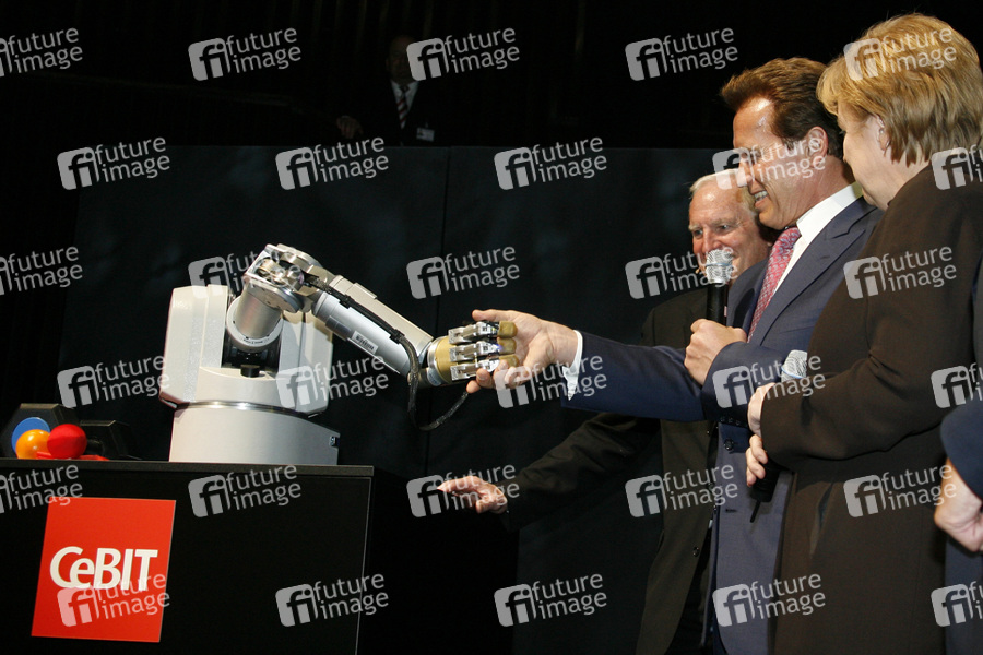 Craig Barrett, Arnold Schwarzenegger, Angela Merkel mit Roboter Marvin