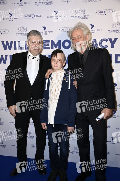 Evgeny Afineevsky / Jewgeni Afinejewski, Roman Oleksiv und Bob Geldof bei der Cinema For Peace Gala 2026 im Hotel Adlon Kempinski. Berlin, 16.02.2026