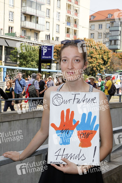 Demonstranten verschiedener Gruppen protestieren unter dem Motto 'Unteilbar: Für eine offene und freie Gesellschaft - Solidarität statt Ausgrenzung' gegen Rassismus, für soziale Gerechtigkeit und gegen Ausgrenzung am Altmarkt. Dresden, 24.08.2019
