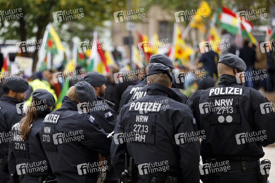 Polizist, Polizistin, Polizei, Hundertschaft, Polizeieinsatz, Polizeibeamte, Polizeibeamter, Polizei-Hundertschaft, Innere Sicherheit, Polizeikräfte, Polizeipräsenz, Polizeiaufgebot, Sicherheitsmaßnahmen, Polizeikräfte, Gewaltmonopol, Polizeibeamte, Einsatkräfte, Kurdendemo, Kurden-Demonstration, Kurden-Demo, NavDem, Nav-Dem, YPG, Rojava, demokratisches Gesellschaftszentrum der Kurdinnen in Deutschland, PKK, Apo, kurdische Arbeiterpartei, Anti-Erdogan-Demo, Kurdistan, Demo, Demonstration, Demonstranten, Politik, Kurden, Kurde, kurdisch, Protest, Aktion, Demo gegen Erdogan, Fahne, Flaggen, Afrin, Syrien, Türkei, Invasion, Einmarsch in Syrien, Versammlungsrecht, Nord-Syrien, Symbolbild, Symbolfoto