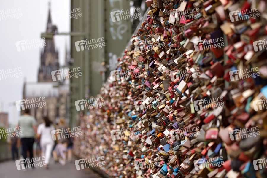 Liebesschloss, Liebes-Schloss, Liebes-Schlösser, Liebe, Treue, Schlösser, Zusammenhalt, Schloss, Vorhängeschloss, Vorhängeschlösser, Deutsche Bahn, Eisenbahnbrücke, Zugverkehr, Schienenverkehr, Statik, Wahrzeichen, Rheinbrücke, Absperrgitter, Altmetall, Korrosionsschutz, Rostschäden, Korrosion, Rost, Brauch, Brauchtum, Liebesbeweis, Treue, Touristenattraktion, Brückenschäden, Kölner Sightseeing, Symbolbild, Symbolfoto