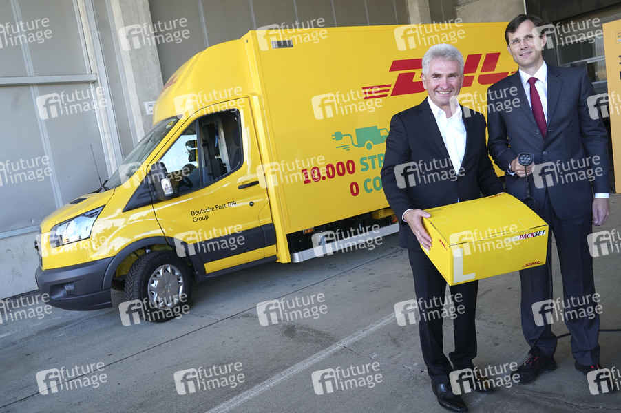 Politiker, FDP, NRW-Wirtschaftsminister, Manager, Konzernvorstand von Deutsche Post DHL Group, DHL, Deutsche Post, Deutsche Post Group, E-Mobility, Etektromobilität, E-Auto, nachhaltig, Post, Paketdienst, Elektroauto, Elektrotransporter, Umwelt, umweltfreundlich, Postzustellung, Symbolfoto, Symbolbild