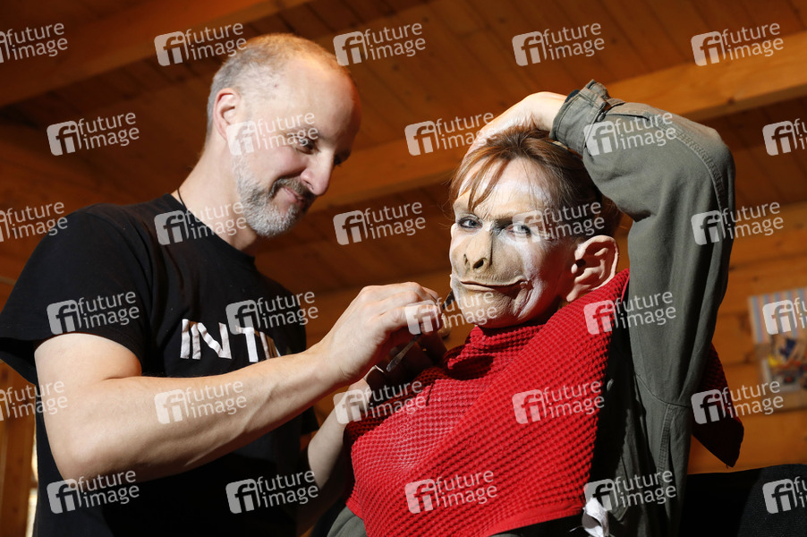 GEEK ART - Bodypainting meets SciFi, Fantasy and more: Enrico Lein mit Assistentin und Model Maria bei der Vorbereitung zum 'Planet der Affen' Photoshooting. Eldagsen, 02.01.2019 - Ein Projekt des Fotografen Tschiponnique Skupin und des Bodypainters und Transformakers Enrico Lein