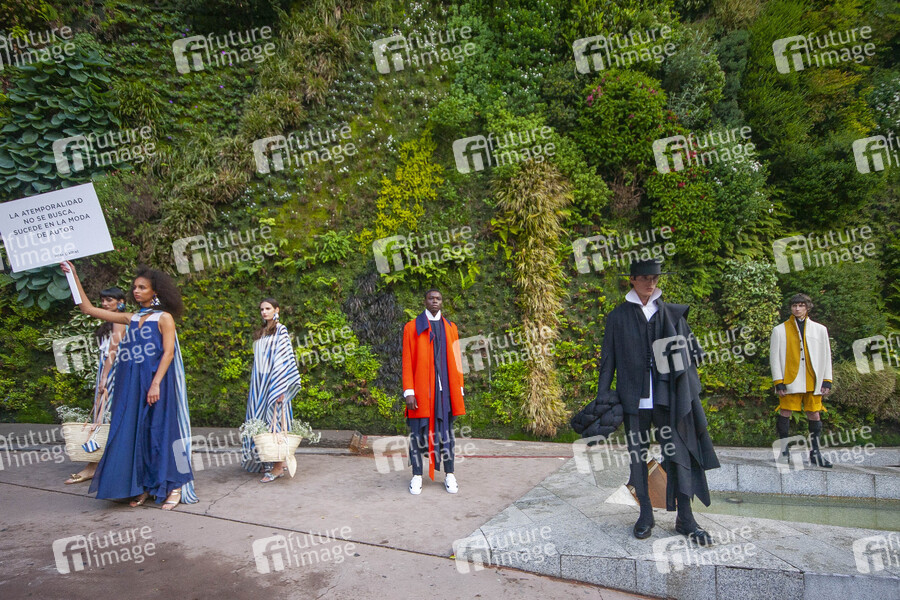 Fashion Show von 10 Modedesignern, die konzipiert wurden, um die charakteristische Mode zu feiern und ihre Rolle in der spanischen Wirtschaft und Kultur zurückzugewinnen auf dem Paseo del Prado. Madrid, 11.04.2021