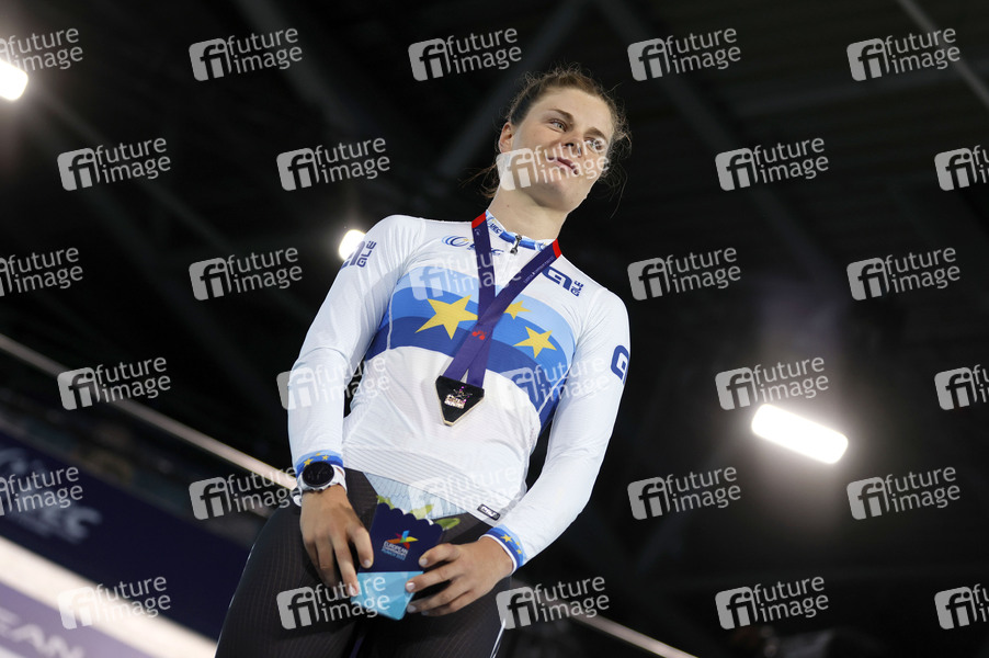 Lotte Kopecky bei der Siegerehrung Ausscheidungsfahren Frauen bei den European Championships 2022 im Bahnradsport in der Messe München. München, 13.08.2022