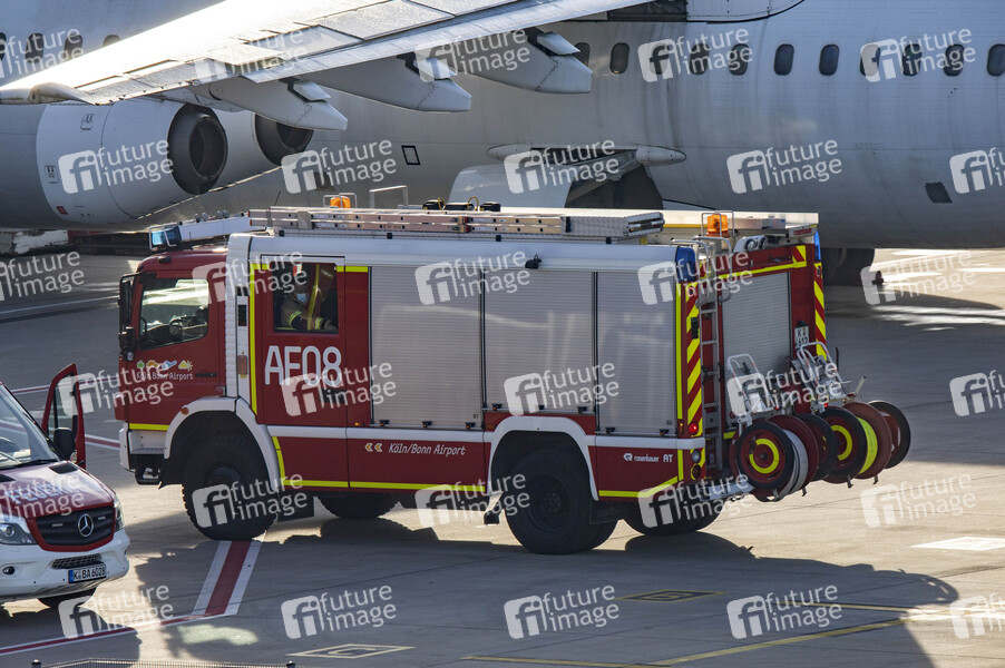 Übungsvorbereitung am Flugzeug bei der Notfallübung der Werkfeuerwehr, der Feuerwehr Köln und den Hilfsorganisationen am Flughafen Köln/Bonn. Im Rahmen der Übung wird die Kollision eines Flugzeugs mit einem Passagierbus und einer Abfertigungshalle simuliert. Einsatzkräfte retten aus dem in Brand geratenen Flugzeug und dem Gebäude Personen und versorgten diese. Köln, 06.11.2021