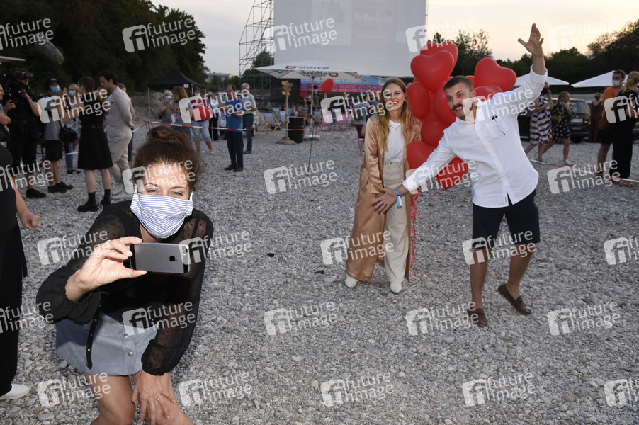 Maggie Peren, Alicia von Rittberg und Edin Hasanovic bei der Premiere des Kinofilms 'Hello Again - Ein Tag für immer' beim Filmfest München Pop-Up im PopUp Autokino auf dem Zenith Parkplatz. München, 12.08.2020