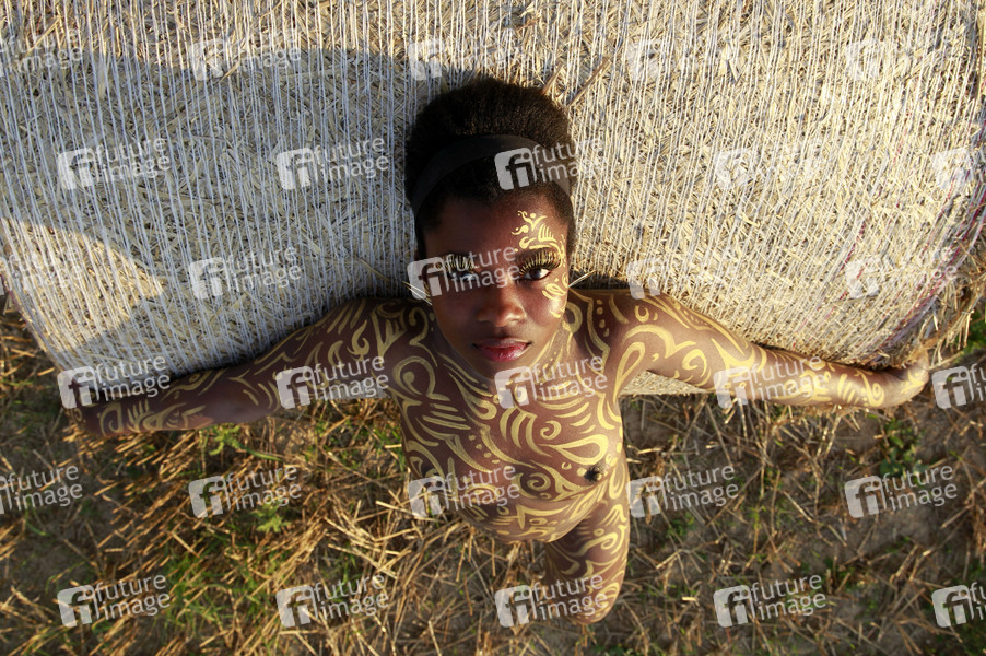 Bodypainting, Erotik, Frau, Mädchen, Afrikanerien, nackt, draußen, weiblich, Körperkunst, Kunst, Ornamente, Malerei, Feld, Acker, Stoppelfeld, Heuballen, Stroh, Landwirtschaft, Ernte, Abendsonne, erotic, African woman, girl, nude, outdoor, female, body art, body painting, ornaments, field, hay, straw, farming, harvest, evening sun