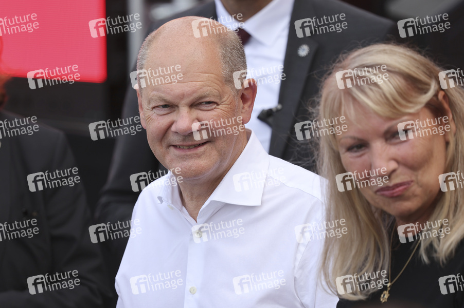 Olaf Scholz und Petra Köpping bei einer Wahlkampfveranstaltung der SPD zur Landtagswahl in Sachsen auf dem Schloßplatz. Dresden, 19.07.2024