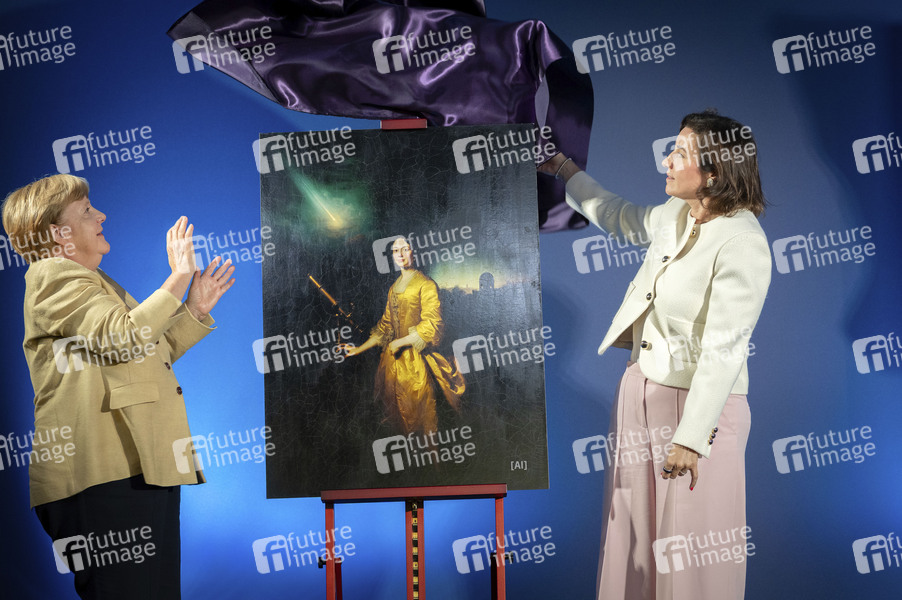 Angela Merkel und Dorothee Bär enthüllen das KI-generierte Bild von Maria Winkelmann-Kirch bei der Ausstellungseröffnung 'Unsichtbare Wissenschaftlerinnen - Versäumte Bilder' im Bundesministerium für Forschung, Technologie und Raumfahrt. Berlin, 16.09.2025