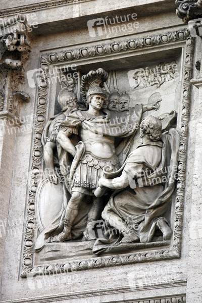 größter Brunnen Roms und einer der bekanntesten Brunnen der Welt, 26 Meter hoch, 50 Meter breit, eingeweiht 1735, besteht aus einer Palastfassade mit Triumphbogen, davor tummeln sich Meeresgestalten auf einer Felslandschaft, Fabelwesen des Meeres, Meerespferde, Tritonen, im Zentrum der herrschaftliche Meeresgott Oceanus