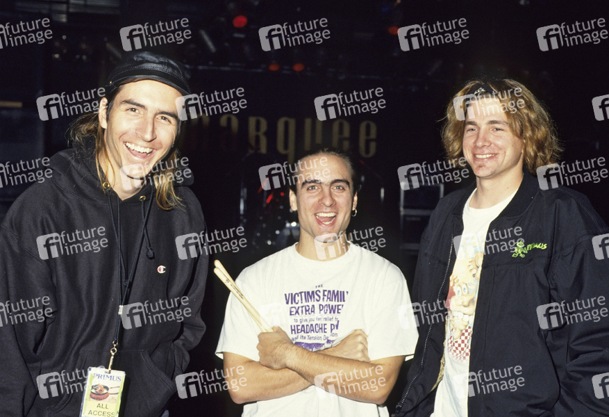 Les Claypool, Tim Alexander und Larry LaLonde von Primus bei einem Photoshooting im Marquee Club. London, 16.03.1991