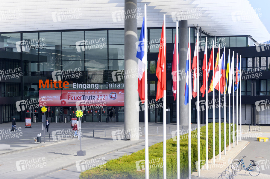 Eingang zur FeuerTrutz, der internationalen Fachmesse mit Kongress für vorbeugenden Brandschutz, in der NürnbergMesse. Nürnberg, 18.10.2021