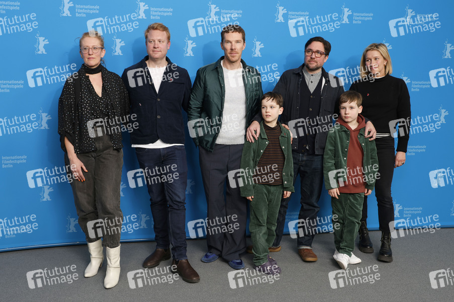 Andrea Cornwell, Adam Ackland, Benedict Cumberbatch, Richard Boxall, Dylan Southern, Henry Boxall und Leah Clarke beim Photocall zum Kinofilm 'The Thing with Feathers' auf der Berlinale 2025 / 75. Internationale Filmfestspiele Berlin im Hotel Grand Hyatt. Berlin, 18.02.2025