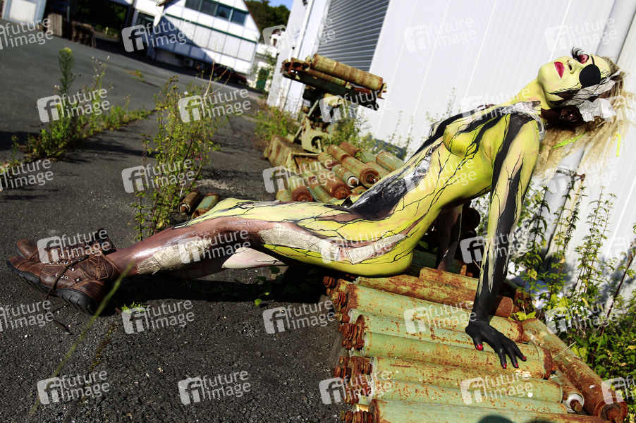 Bodypainting und Photoshooting mit Model Jutta auf einem Industriegelände in Hameln. Bodypaint-Künstler: Jörg Düsterwald, Make-Up und Hairstyling: Nadja Lück