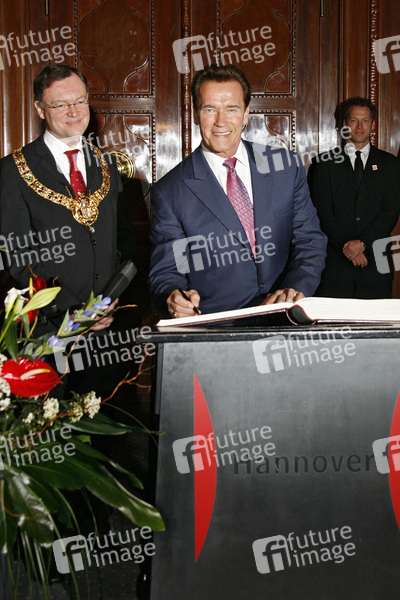 Hannovers Bürgermeister Weil empfängt den kalifornischen Gouverneur Schwarzenegger im Neuen Rathaus zum Eintrag ins Goldene Buch