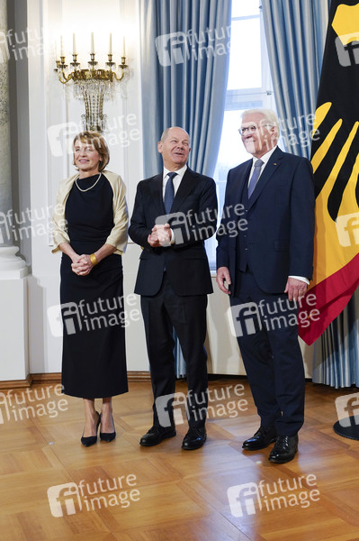 Elke Büdenbender, Olaf Scholz und Frank-Walter Steinmeier beim Neujahrsempfang des Bundespräsidenten im Schloss Bellevue. Berlin, 10.01.2025