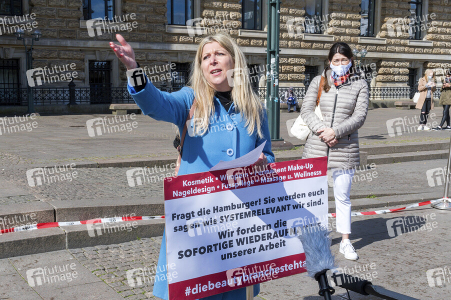 Yvonne Guberinic, Mitorganisatorin und Inhaberin vom Beautysalon WunderSchön, bei der Demonstration der Beautybranche und Tattoostudios vor dem Rathaus für die Erlaubnis der Wiedereröffnung ihrer Geschäfte. Hamburg, 12.05.2020