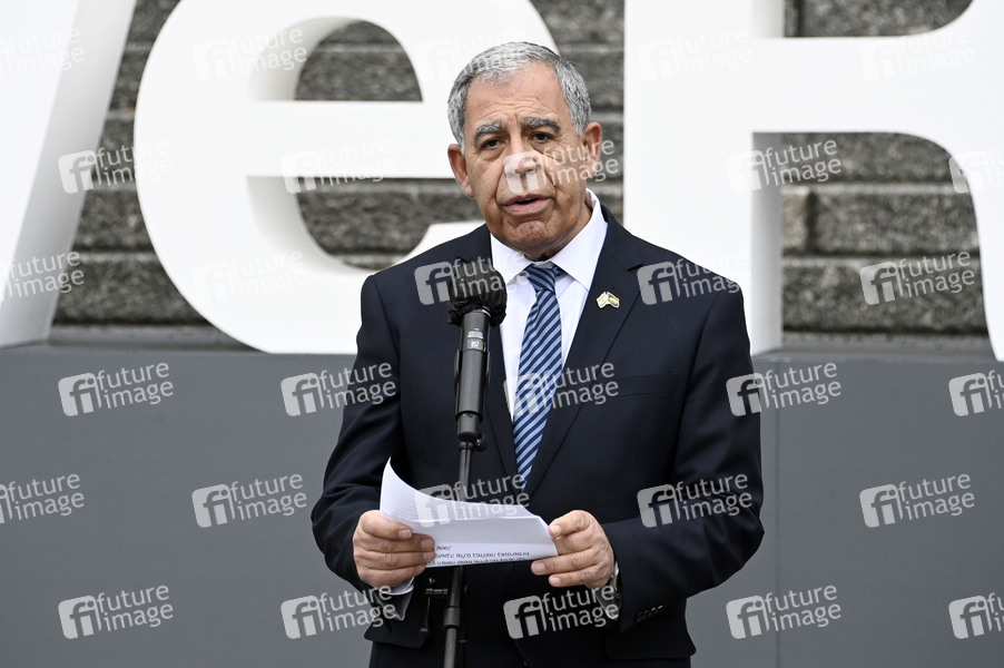 Mickey Levy bei Pressestatements von Wolfgang Sobotka, Mickey Levy und Bärbel Bas am Schriftzug #WeRemember zur Erinnerung an die Millionen im Nationalsozialismus ermordeten Juden vor dem Reichstagsgebäude. Berlin, 25.01.2022