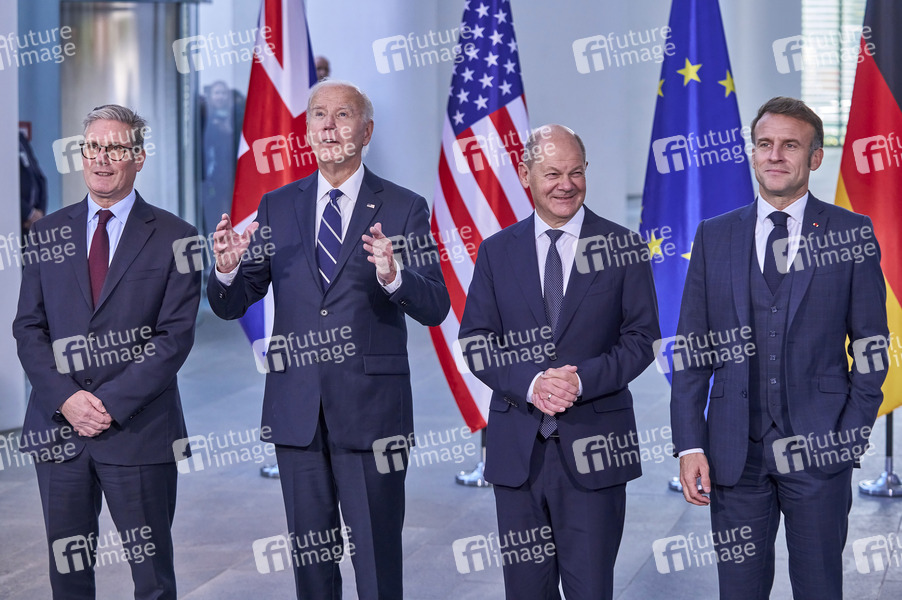 Keir Starmer, Joe Biden, Olaf Scholz und Emmanuel Macron beim Familienfoto vom QUAD Treffen anlässlich des Besuches des Präsidenten der Vereinigten Staaten im Bundeskanzleramt. Berlin, 18.10.2024