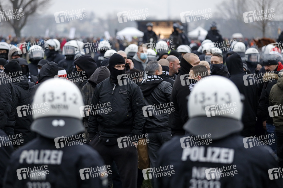 Polizisten kesseln eine Gruppe Hooligans auf der Querdenken-Demo im Rheinpark Golzheim ein. Düsseldorf, 06.12.2020