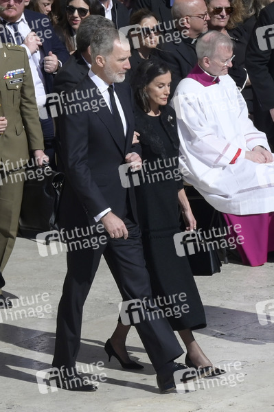 König Felipe VI. von Spanien und Königin Letizia von Spanien bei der Trauermesse für den verstorbenen Papst Franziskus auf dem Petersplatz. Vatikanstadt, 26.04.2025