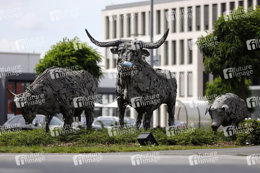 Schlachter, Schlachtbetrieb, Schlacht, Tiere, Kuh, Rind, Stier, MNS, Mund-Nasen-Schutz, Atemmaske, Schutzmaske, Schwein, Schweinefleisch, Rindfleisch, Steak, Schnitzel, Döner, Fleisch, Fleischindustrie, Schlachtung, Fleischverarbeitung, Werkverträge, Tierschutz, Zerlegung, Lebensmittel, Fleisch essen, Lebensmittelindustrie, Tönnies-Logo, Tönnies, Toennies, Tönnies-Arena, Kühlkette, Kühlwagen, Hauptwerk, Tiertransporte, Corona, Virus, Coronavirus, Coronakrise, Corona-Krise, Coronainfektionen, Infektionen, Neuinfektionen, Fleischerhandwerk, Corona-Ausbruch, Ausbruch, Hygiene, Skulpturen, Figuren, Maske, Maskenpflicht, Fleischskandal, Fleisch-Skandal, Symbolbild, Symbolfoto