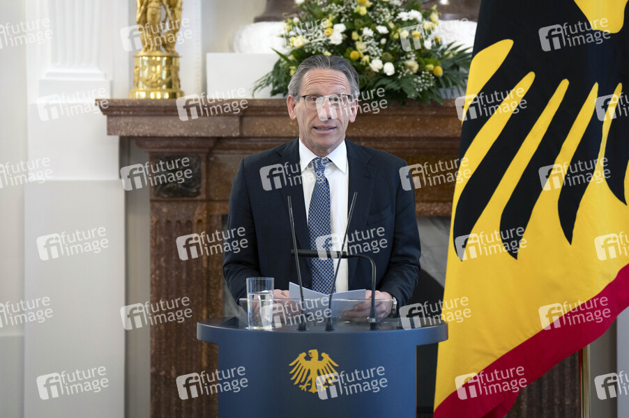 Jörg Kukies bei der Übergabe der Wohlfahrtsmarken 2025 durch den Bundesminister der Finanzen an den Bundespräsidenten im Schloss Bellevue. Berlin, 21.02.2025