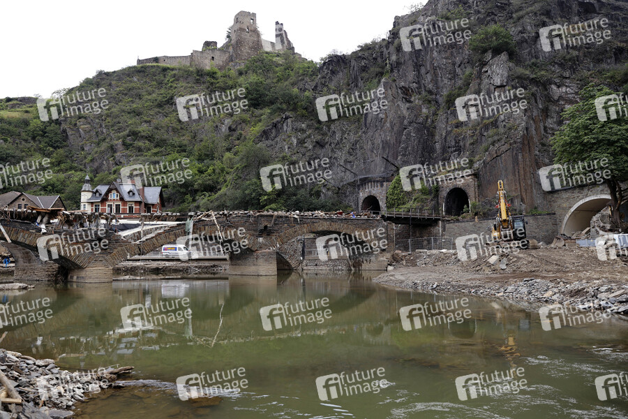 Nach dem Jahrhunderthochwasser in der Eifel durch heftige Regenfälle und Dauerregen mit Überschwemmungen und Überflutungen haben die Aufräumarbeiten im Ahrtal große Fortschritte gemacht. Einheiten von Polizei, THW, Bundeswehr und Feuerwehr mitsamt vielen freiwilligen Helfern haben Straßen geräumt, Schutt und Schlamm entfernt und die Menschen versorgt. Der Wiederaufbau wird trotzdem Jahre dauern. Im Bild Flutschäden an einer Eisenbahnbrücke in der Ortschaft Altenahr, in der die Flut viele Häuser zerstörte, 08.08.2021