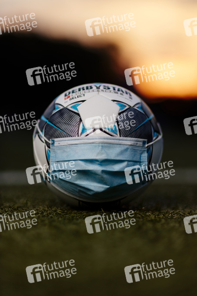 Der offizielle Spielball der Bundesliga Derbystar liegt mit Mundschutz auf einem Fußballplatz. Königsdorf, 02.09.2020