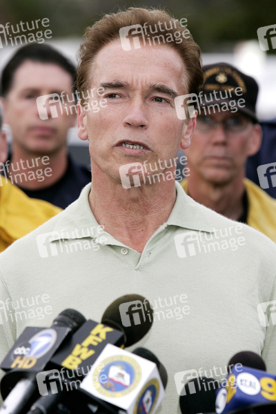 Gouverneur Arnold Schwarzenegger trifft sich mit Pressevertretern, Feuerwehrmännern und Opfern der Feuerkatastrophe an der Corral Canyon Road. Malibu, 27.11.2007