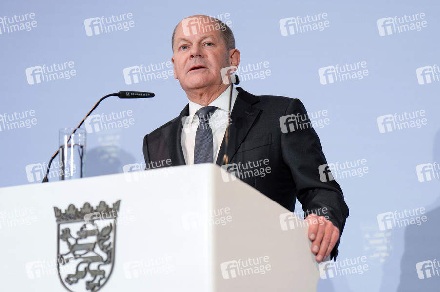 Olaf Scholz bei der Pressekonferenz zur Ministerpräsidentenkonferenz zur Flüchtlingspolitik von Bund und Ländern in der Vertretung des Landes Hessen beim Bund. Berlin, 06.03.2024