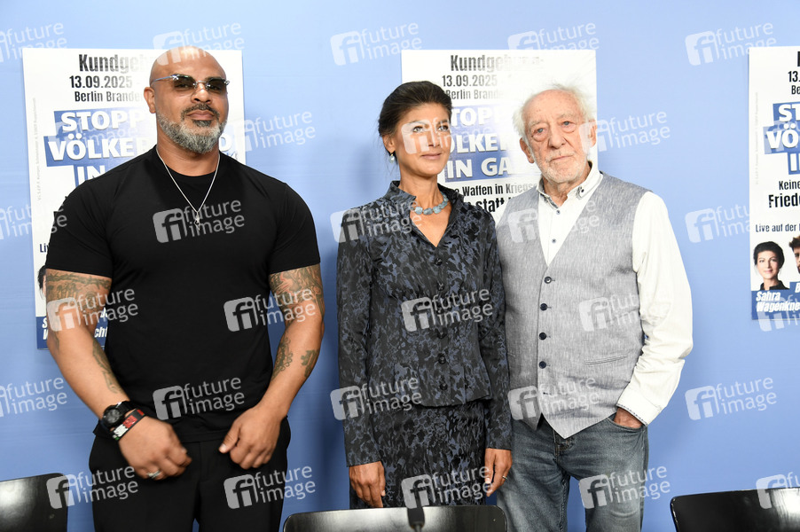 Massiv, Sahra Wagenknecht und Dieter Hallervorden bei der Pressekonferenz zur Friedenskundgebung am 13. September im Tagungszentrum im Haus der Bundespressekonferenz. Berlin, 08.09.2025