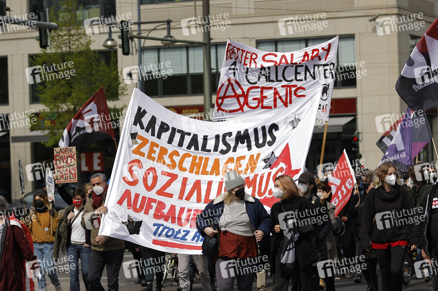 Sozialistische Demo am Hackeschen Markt. Etwa 800 Personen demonstrieren in Mitte unter dem Motto 'Nicht auf unserem Rücken - Gewerkschaften und Lohnabhängige in die Offensive!'. Die Demo begann an der DGB-Zentrale und endete mit einer Kundgebung am Roten Rathaus. Berlin, 01.05.2021