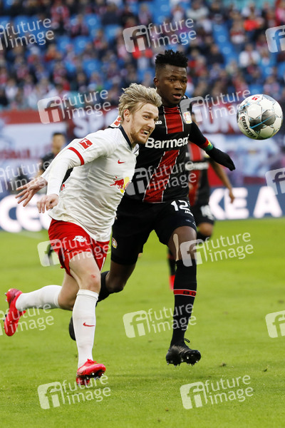 Emil Forsberg und Edmond Tapsoba beim Fußballspiel RB Leipzig - Bayer 04 Leverkusen am 24. Spieltag der Fußball-Bundesliga in der Red Bull Arena. Leipzig, 01.03.2020