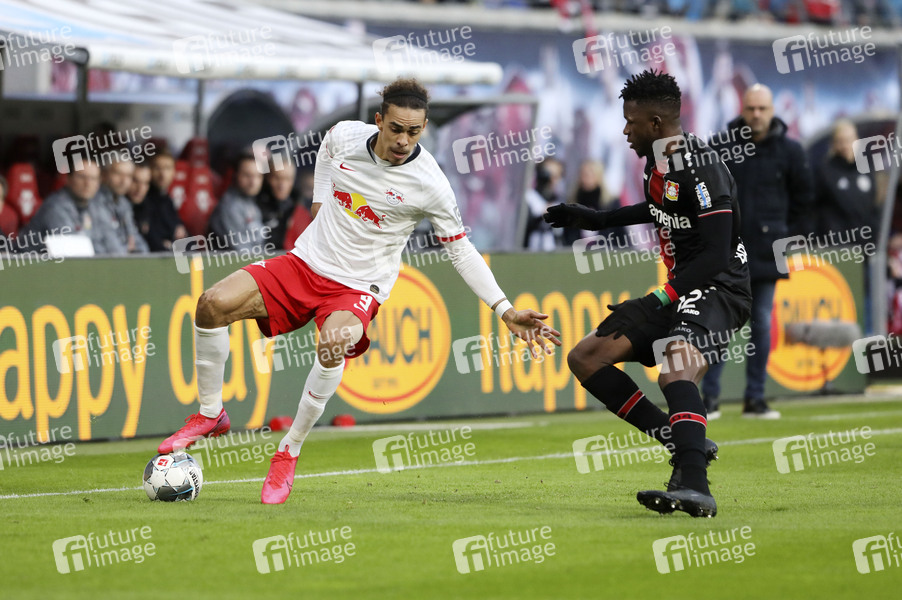Yussuf Poulsen und Edmond Tapsoba beim Fußballspiel RB Leipzig - Bayer 04 Leverkusen ( Endstand 1:1 ) am 24. Spieltag der Fußball-Bundesliga in der Red Bull Arena. Leipzig, 01.03.2020
