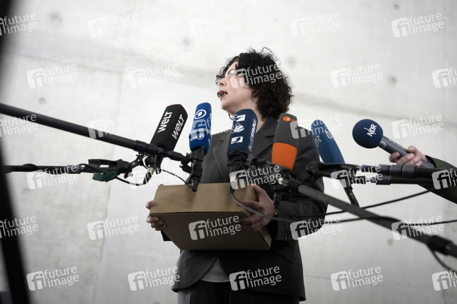 Amira Mohamed Ali übergibt Einspruch vom BSW gegen das amtliche Endergebnis der Bundestagswahl 2025 beim Wahlprüfungsausschuss im Paul-Löbe-Haus. Berlin, 23.04.2025