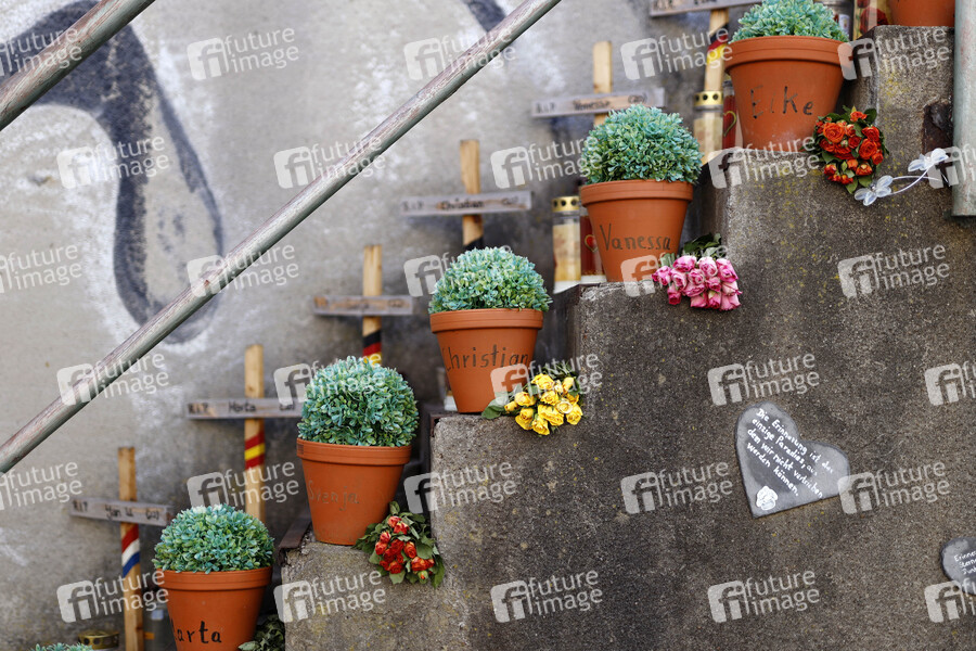 Denkmal, Blumen, Kränze, Lichter, Kerzen, Grablichter, Kreuze, Tunnel, Erinnerung, Opfer, Loveparade, Katastrophe, Unglück, Panik, Massenpanik, Todesopfer, Loveparade 2010, Duisburg, Tunnel, Treppe, Gedenkstätte, 10 Jahre Loveparade-Katastrophe, Unglück bei der Loveparade 2010